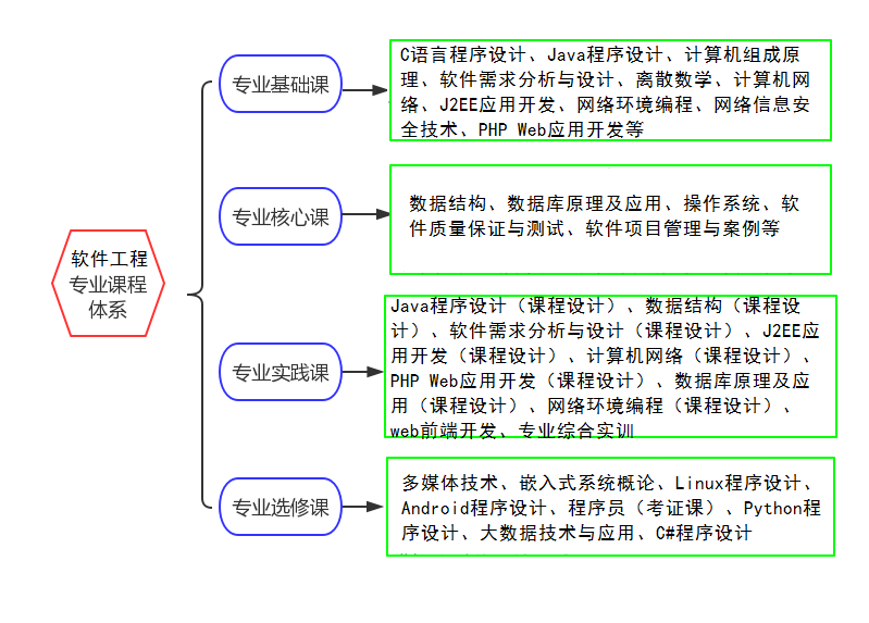 软件工程专业培养方案中对专业课程体系分为四大模块:专业基础课、专业核心课、专业选修课、专业实践类课程。