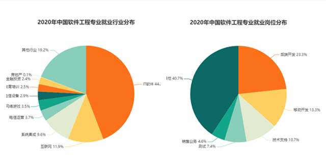 从2020年中国软件工程专业就业行业分布来看,44.2%的毕业生就业于IT软件行业,比例最大;从2020年中国软件工程专业就业岗位分布来看,23.3%的毕业生从事后端开发岗位。
