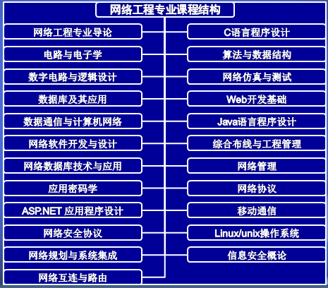 主要课程:网络工程专业导论、C语言程序设计、电路与电子学、数据结构、数字电路与逻辑设计、网络仿真与测试、数据库及其应用、web开发基础、数据通信原理、Java语言程序设计、综合布线与工程管理、网络管理、网络协议、移动通信、应用密码学、Hadoop数据库、大数据技术及应用、信息安全概论、网络规划与集成、网络互连与路由等。
