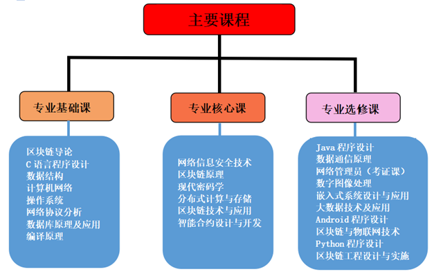 专业基础课:区块链导论、C语言程序设计、数据结构、计算机网络、操作系统、网络协议分析、数据库原理及应用、编译原理。