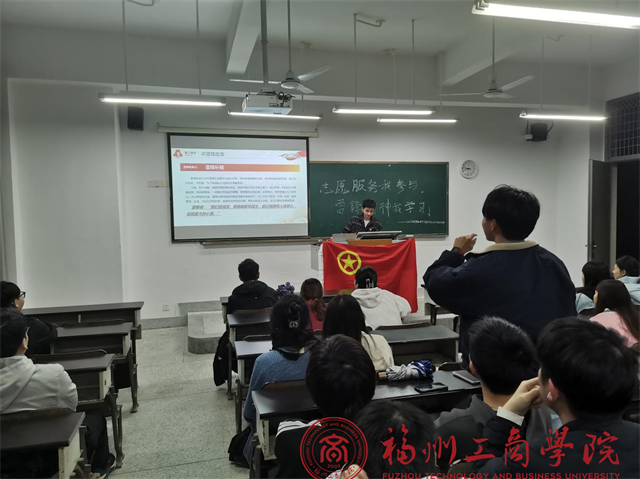 团员代表向同学们分享我们广大青年在日常中该如何践行雷锋精神以及怎样把雷锋精神一代代传递下去。最后团支书播放了由共青团中央出版的《雷锋——永不过时的“小鲜肉”》