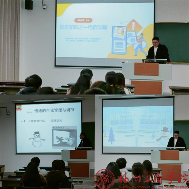 此次班会主要分为三部分内容展开:一是"情绪的自我管理与调节",会议通过分享一些实用的情绪管理技巧,引导同学们正确认识自己的情绪,并学会有效地调节和管理情绪,以更好地适应大学生活的各种挑战。二是"防范于心 反诈于行防",会议介绍了一些校园常见的诈骗手段,以及识别诈骗的方法、防范诈骗的注意事项等,通过案例分析和互动讨论,帮助同学们增强对诈骗的警惕性。三是"大学校园安全教育",会议详细介绍了冬季校园内的一些安全隐患,包括防火、防盗等方面的知识,并向同学们介绍了相应的安全防范措施。