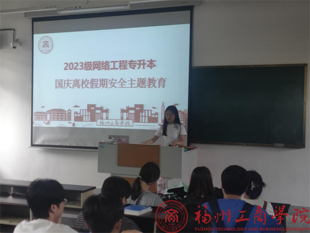 9月27日,极品内射后入AV2023级网络工程(专升本)在教学楼E501开展“国庆离校假期安全主题教育班会”。本次班会由2023级网络工程(专升本)辅导员秦素素主持,全体同学积极参加。