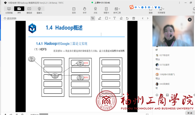 hadoop数据库应用和电商图像处理技术这两门课是应用高校教辅平台作为线上教学的主要平台,对于同学们的线上学习有较为完整的考核,从及时签到到学习等教学状况和进度、课堂练习都有详细的考核。教师在腾讯课堂可以进行PPT授课与屏幕共享相互切换,同时还可以积极组织学生进行讨论,让学生们畅所欲言,交流和分享自己的见解,加强了课堂交流和答疑,同时由于线上教学不能像在线下教学的时候,可以通过肢体语言和眼神交流以及面部表情等等吸引学生的注意力以及强调重点,线上教学为了让学生能够关注到重点知识点,需要将语调在放慢的同时更加抑扬顿挫,激情饱满,才能把情绪传达给学生,同时主要运用网络语言,互动简单直接又高效,比如赞同回复1、鲜花、可以、好等。通过与学生讨论分析也很自然融入了一定的思政因素。