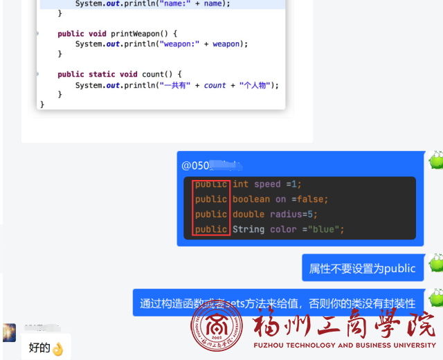 课前10分钟进入课堂并分享课堂链接,@全体成员,提醒同学们做好上课准备,同时进行签到,严格考勤。课堂过程中进行QQ群互动,及时解答课堂或者实验中遇到的问题。对同学的错误进行分析及纠正,让其他同学也能避开此类错误。