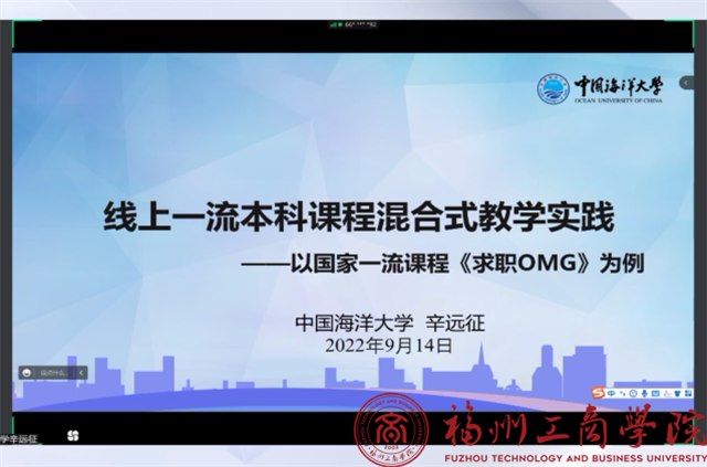 中国海洋大学教务处辛远征副处长,长期从事大学生职业发展与就业指导、个体咨询工作。主讲国家级一流课程、国家精品在线开放课程《求职OMG》,她从在线教学资源与课程的建设运行、基于在线课程的混合式教学设计和混合式教学实践与评价等方面对混合式教学的开展作了详细的介绍。