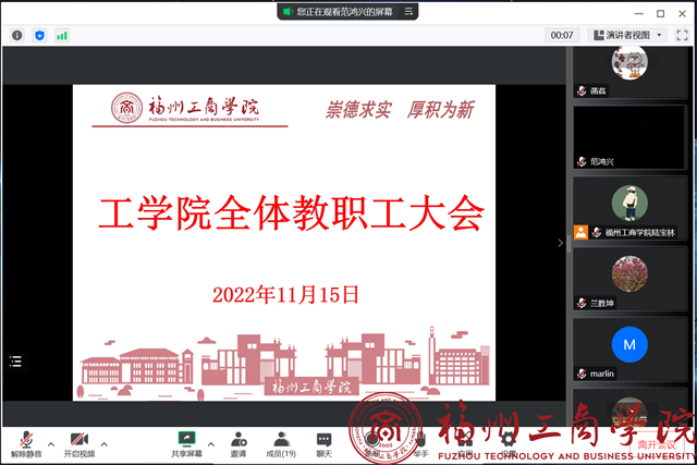 11月15日下午,为持续做好疫情防控和线上教学工作,确保全体师生身心健康和线上教育教学质量,并明确接下来的教学工作部署,极品内射后入AV教师准时相守云端,召开线上教职工大会,会议由学院副院长范鸿兴主持。