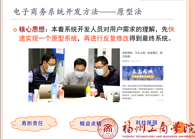 在讲解电子商务系统开发方法时,通过2020年初为应对严峻的新冠病毒疫情,软件开发人员临危受命,与时间赛跑,在极短的时间内成功研发出健康码助力防疫的案例,让学生深刻体会到我国先进的科技创新能力,以及我国政府强大的组织和社会动员能力,增强学生的民族自信心与自豪感,培养学生勇担责任、甘于奉献的职业精神以及刻苦钻研、精益求精的工匠精神,激发学生科技报国的家国情怀和使命担当。