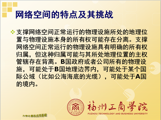 例如《大学计算机应用基础》中的《计算机网络安全》内容主要讲的就是互联网安全相关技术。根据内容可以很自然的加入个人互联网使用时安全防范以及互联网使用的道德规范的思政元素。在网上学习了沈逸老师的《互联网空间治理》相关内容后,在这一章加入了国家层面的思政内容,通过和学生探讨互联网空间是否有国界,从而引出互联网主权问题和互联网层面的国家安全。