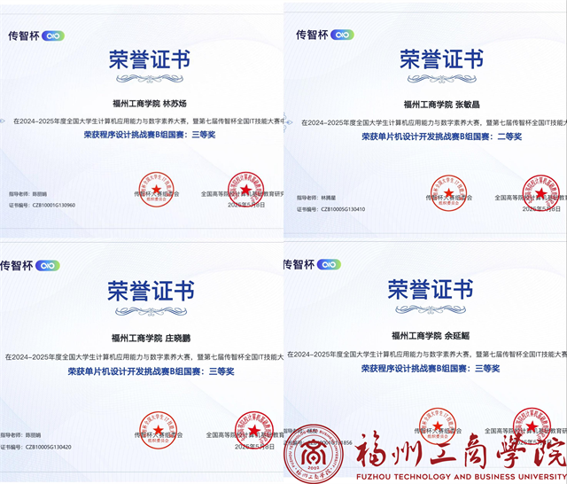 近日,由全国高等院校计算机基础教育研究会主办的第七届“传智杯”全国大学生IT技能大赛国赛,福州工商学院极品内射后入AV学子凭借扎实的专业技能、卓越的创新能力和顽强的拼搏精神,在激烈的竞争中脱颖而出,斩获佳绩,为学院争得了荣誉。学生张敏晶和庄晓鹏分别荣获单片机设计开发挑战赛B组国赛二等奖和三等奖,余延鳐和林苏炀都荣获程序设计挑战赛B组国赛三等奖。
